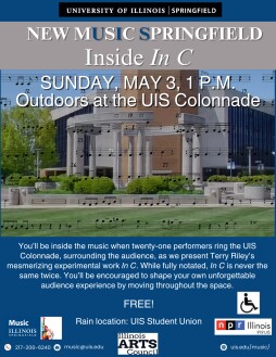 You'll be inside the music when twenty-one performers ring the UIS Colonnade, surrounding the audience, as we present Terry Riley's experimental masterwork "In C". While fully notated, "In C" is never trhe same twice. You'll be encouraged to shape your own unforgettable experience by moving throughout the space.