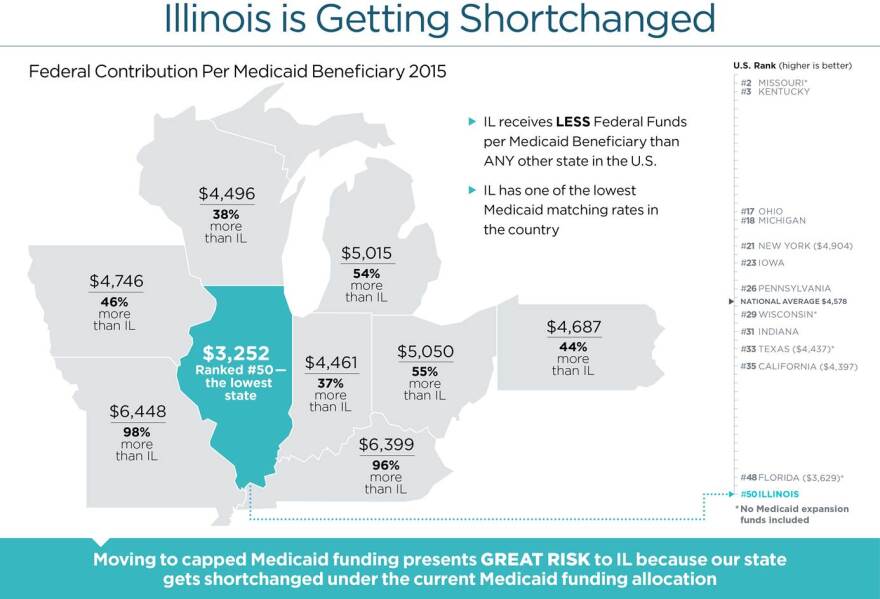 The other 30 states that expanded their Medicaid programs face similar difficulty, but Illinois would deal with the greatest hardship. Here’s the backstory. Federal payment rates for Medicaid were set in 1965 when Illinois was wealthier. Today, Illinois receives less federal funds per Medicaid beneficiary than any other state in the country. One proposal out of Washington, D.C. calls for a per capita cap on federal Medicaid spending per beneficiary. Illinois would be locked into its 2016 Medicaid expenditures, leaving the state in last place for Medicaid spending. “That could have been a catastrophe for the state of Illinois,” McCulley says. “Our ability to provide the same level of coverage and care and access would be hampered without a comparable replacement.” Consider the disparity. Even though Ohio has a smaller population and fewer Medicaid patients than Illinois, it received $4.6 billion more in Meadicaid funding than Illinois in 2015. Likewise, experts say Illinois stood to lose $40 billion in federal money over the next 10 years if the American Health Care Act had been approved. The dollar loss was based on a report put out by the Congressional Budget Office that said 24 million Americans would lose coverage under the plan. “Illinois can’t withstand billions in Medicaid funding cuts to patients, health care delivery systems, hospitals, the state economy and budget,” Wilhelmi says.