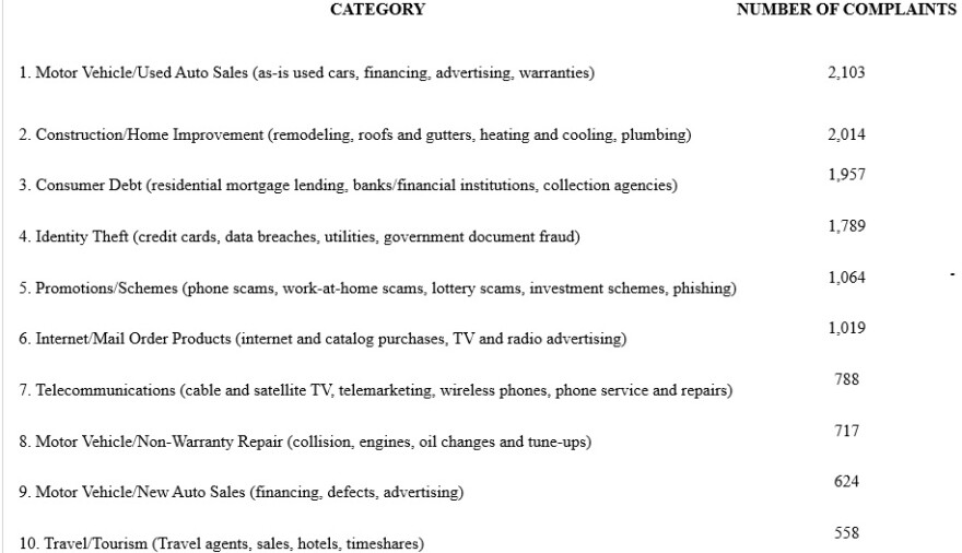 Complaints related to consumer debt increased over those in 2024 and remained third on the list, while complaints related to home repairs and remodeling declined but still came in second.